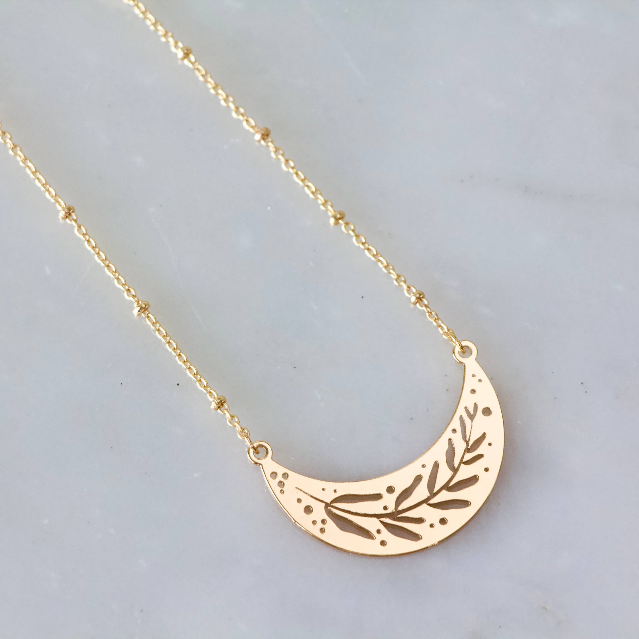 Details: • MATERIAL: 18k gold plated over brass • PENDANT SIZE: Moon phase 25x23mm, Moth 38x20mm, Leaf 30x10mm • CHAIN LENGTH: 18" gold plated chain + 1.5" extender chain • CLASP STYLE: Lobster clasp