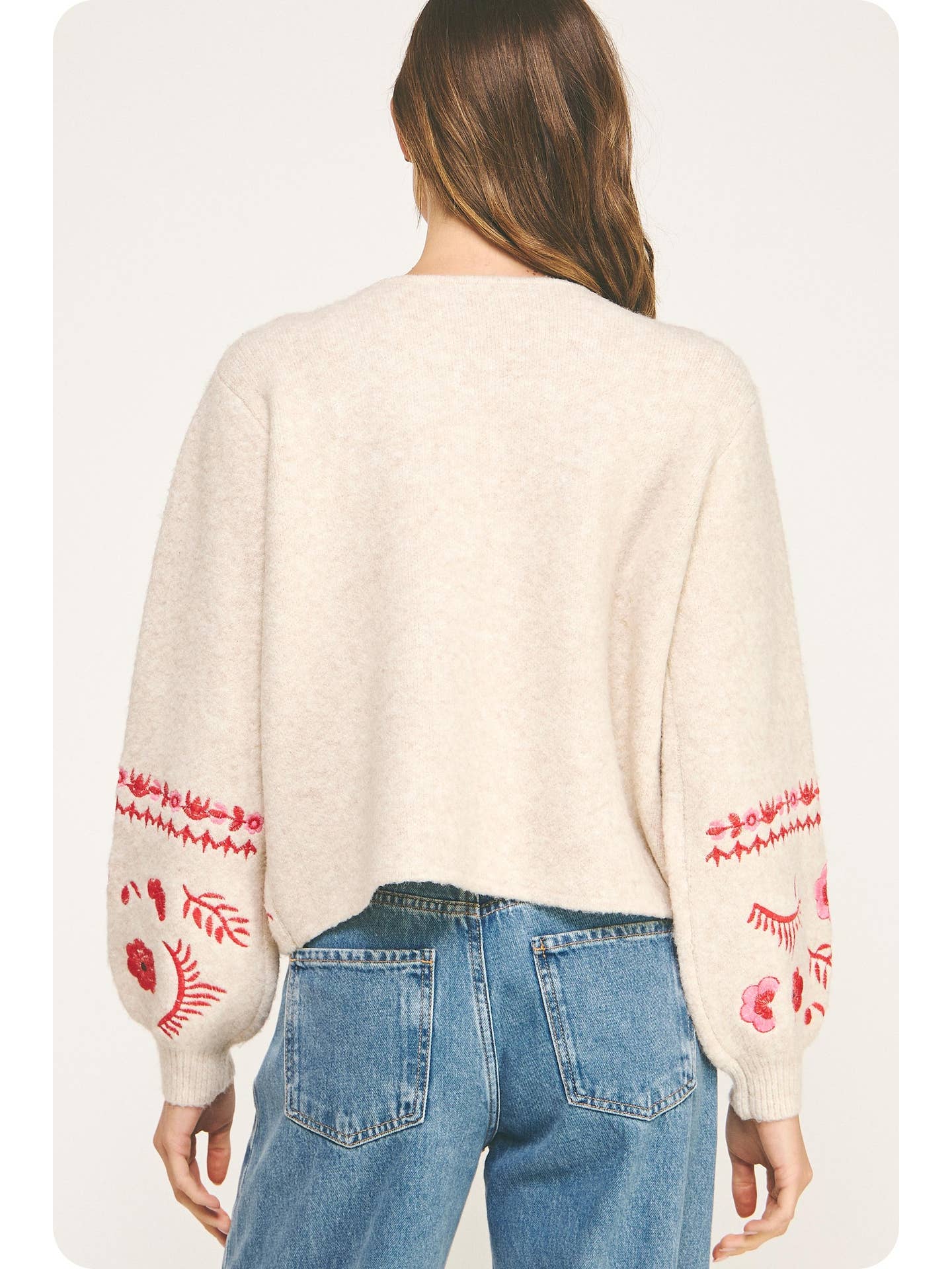Embroidered sweater cardigan in knit fabric. This versatiile knitted cardigan features floral embroidery throughout front/sleeves, long sleeves with ribbed cuff, and a round neck with hook and eye closure.