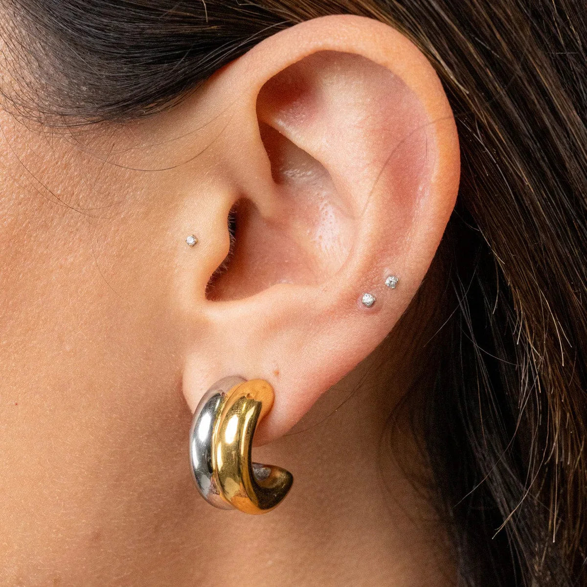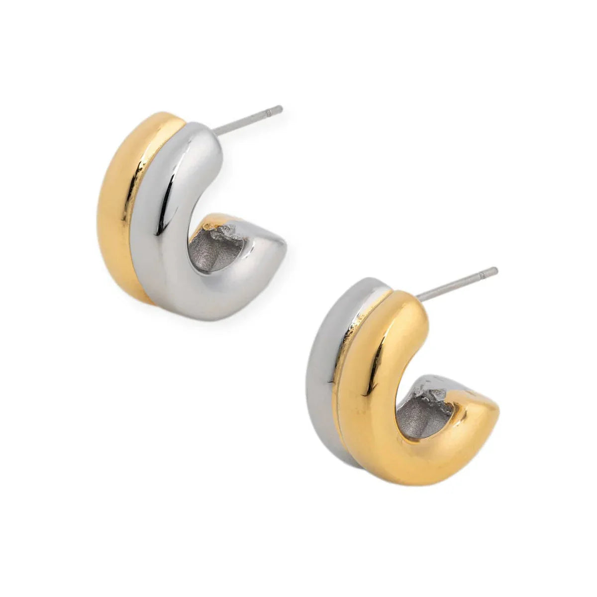 These Nash Two Tone Hoops are fashionable earrings perfect for adding elegance to any outfit. It is a one-of-a-kind accessory that features a combination of metals. These mini chunky half hoops are not only resistant to water, but they are also strong enough to be worn daily.
