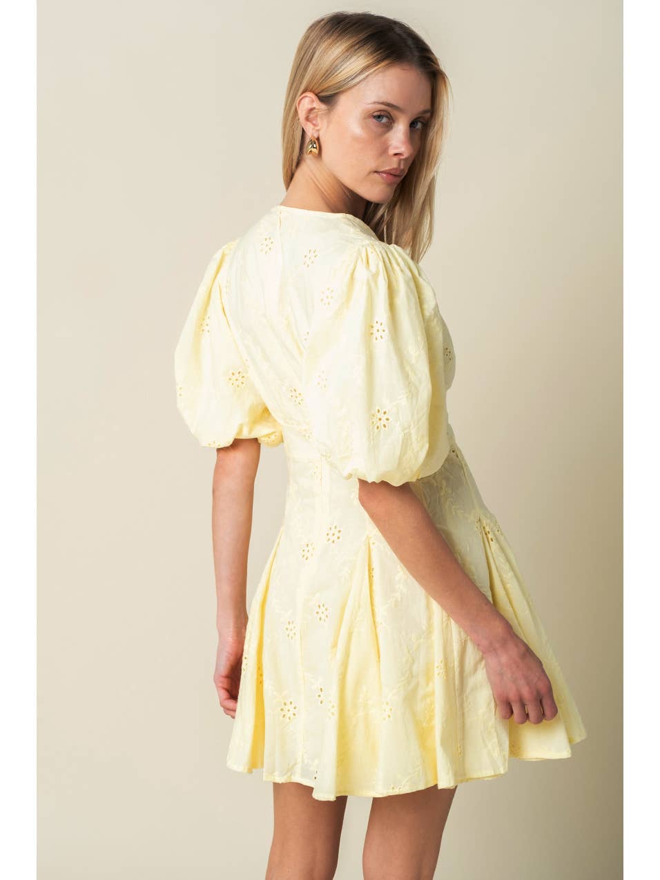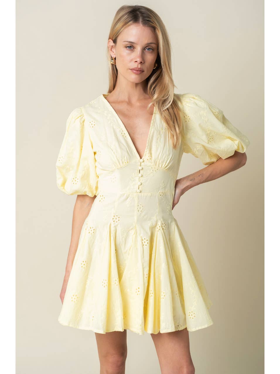 Our Celeste Puff-Sleeve Flare Mini Dress features a timeless, feminine silhouette crafted in a lightweight textured cotton fabric with subtle detailing throughout. Designed with a flattering V neckline, delicate front button and back zipper closure, this mini dress showcases softly structured puff sleeves and a fitted bodice that flows into a flared skirt.