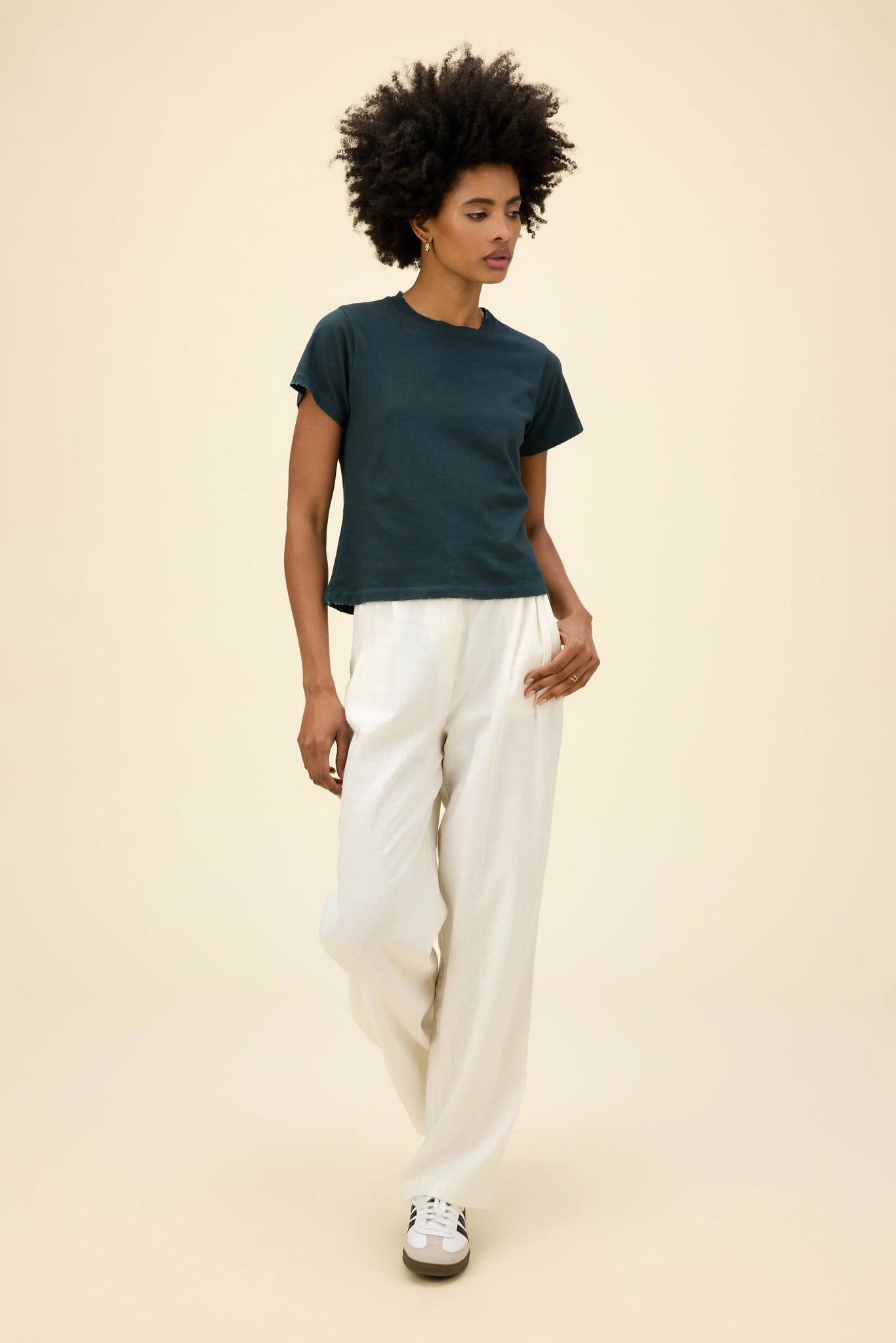 - Accented with a crew neckline and vintage inspired single needle ladder stitch at all hems.